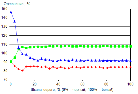 Что касается точности цветопередачи (дельта Е), то, увы, здесь рассмотренному экрану похвастать нечем. При доле белого более 10% (по шкале серого) значение дельта Е составляет порядка 10 единиц. Конечно, говорить о правильной цветопередаче в данном случае нельзя.