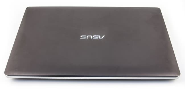 У закрытого ноутбука по боку идет серебристая полоса — это выступающая часть клавиатурной панели. На ней расположены все разъемы. Нижняя часть корпуса сделана из черного шершавого пластика и скошена книзу, т. е. ее практически не видно, когда ноутбук стоит на столе. Благодаря сочетанию темной алюминиевой крышки и светлой полосы по бокам Asus N550Jv не только красивее смотрится, но и кажется более тонким.