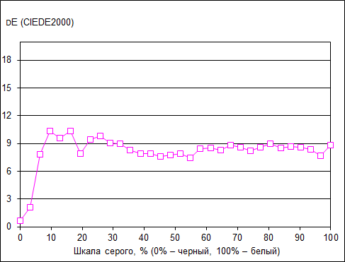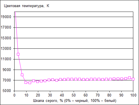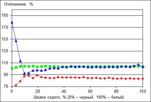 Минимальная яркость экрана на белом фоне составляет 32,58 кд/м², а на черном фоне — 0,04 кд/м². При минимальной яркости экрана контраст составляет 870:1, а значение гаммы — 2,17.