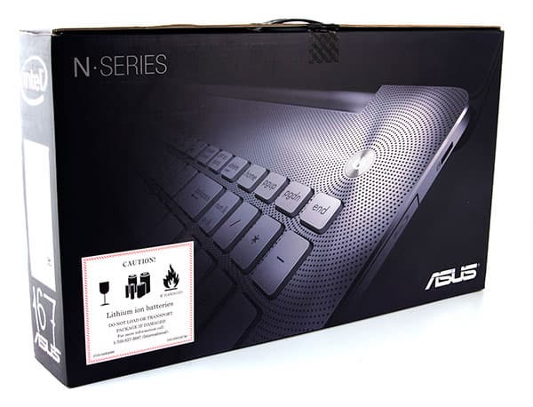 Ноутбук Asus N750JV поставляется в довольно громоздкой по своим размерам коробке с ручкой, которая оформлена в традиционном для ноутбуков Asus N-серии стиле. Причем громоздкость упаковки объясняется тем, что большая часть пространства ничем не занята. То есть это просто воздух в пустых картонных коробках-вкладышах.