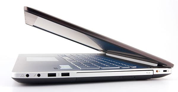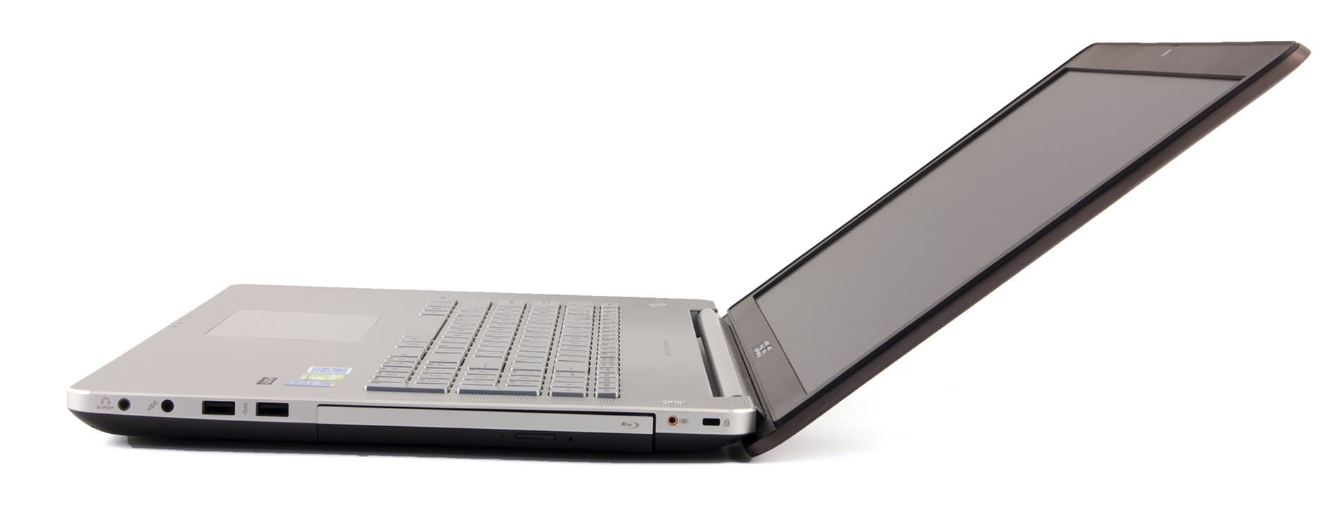 На правом торце корпуса ноутбука расположены еще два разъема USB 3.0, два аудиоразъема типа миниджек (наушники, микрофон), разъем для подключения сабвуфера и отверстие для кенсингтонского замка. Кроме того, на правом торце расположен лоток оптического привода.