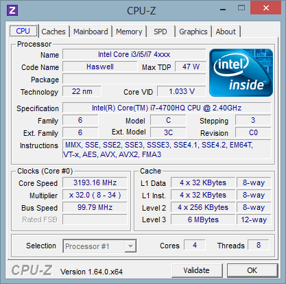Итак, основой ноутбука Asus N750JV-T4008H является четырехъядерный процессор Intel Core i7-4700HQ в сочетании с чипсетом Intel HM86. Процессор Intel Core i7-4700HQ имеет номинальную тактовую частоту 2,4 ГГц, которая в режиме Turbo Boost может повышаться до 3,4 ГГц. Размер кэша L3 составляет 6 МБ, а TDP этого процессора составляет 47 Вт. В этот процессор интегрировано графическое ядро Intel HD Graphics 4600, базовая частота которого составляет 400 МГц, а частота в режиме Turbo Boost — 1,2 ГГц.
