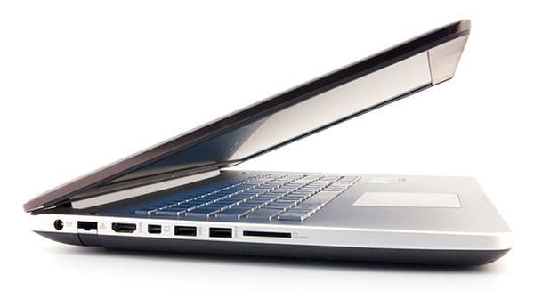 На левом торце корпуса ноутбука расположены два порта USB 3.0, разъемы HDMI и Mini-DisplayPort, разъем RJ-45, а также слот для карт памяти и разъем для подключения адаптера питания. Разъем RJ-45 имеет откидывающуюся крышку, что позволило сделать корпус ноутбука достаточно тонким.