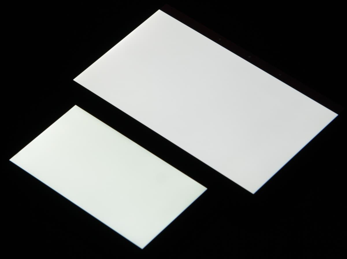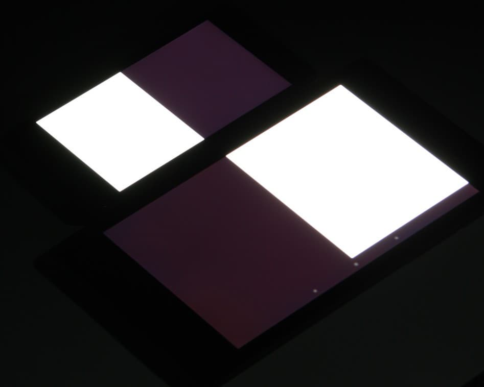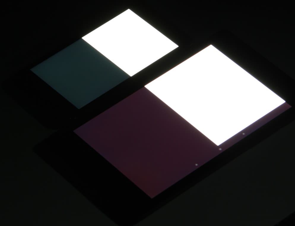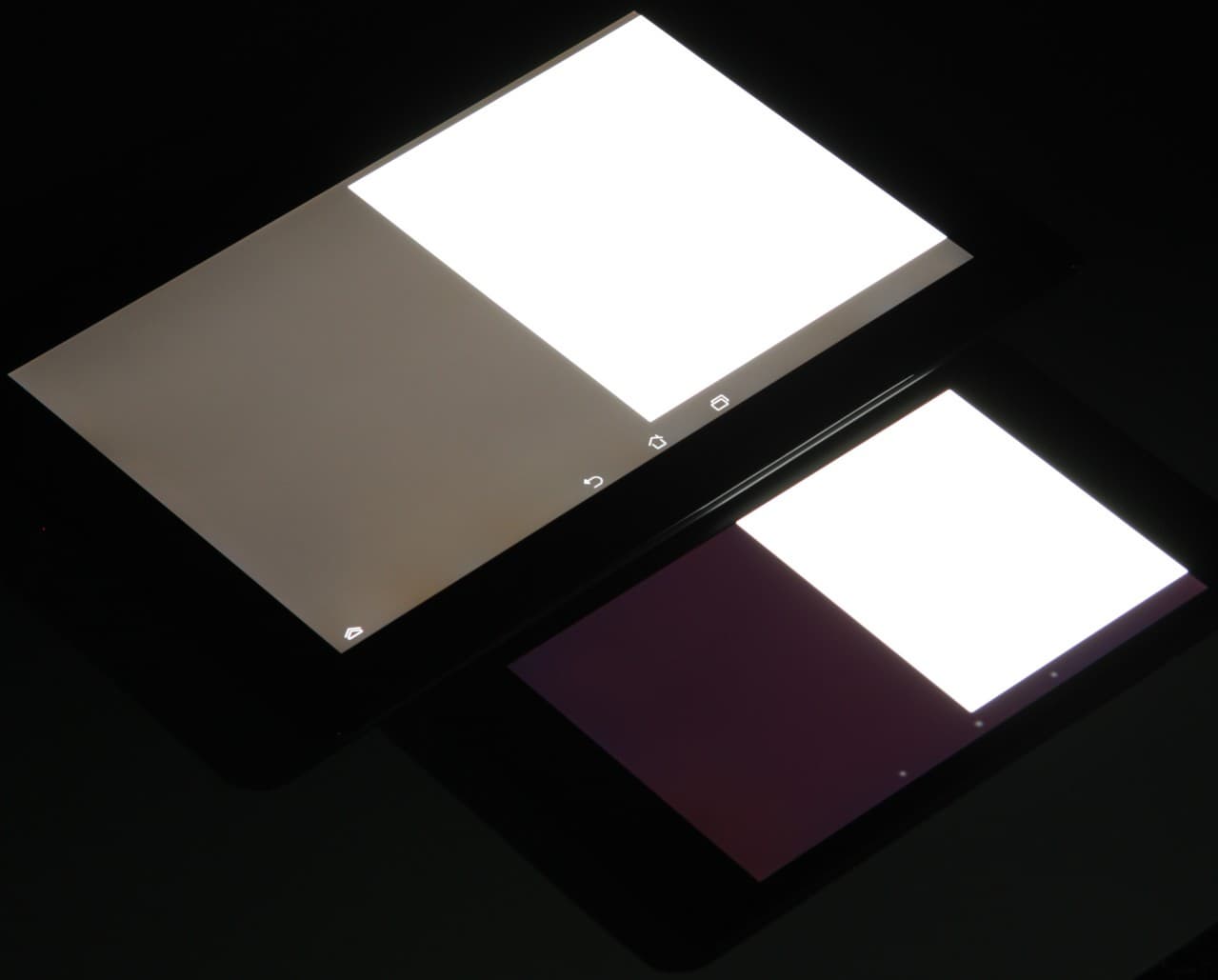 Яркость под углом у обоих экранов заметно уменьшилась, но в случае этого смартфона падение яркости чуть меньше. При этом цветовой тон изменился несильно. Черное поле при отклонении по диагонали высветляется очень мало и приобретает красно-фиолетовый оттенок или остается почти нейтрально-серым. Фотографии с Nexus 7 для сравнения это показывают (яркость белых участков у обоих экранов одинаковая!):