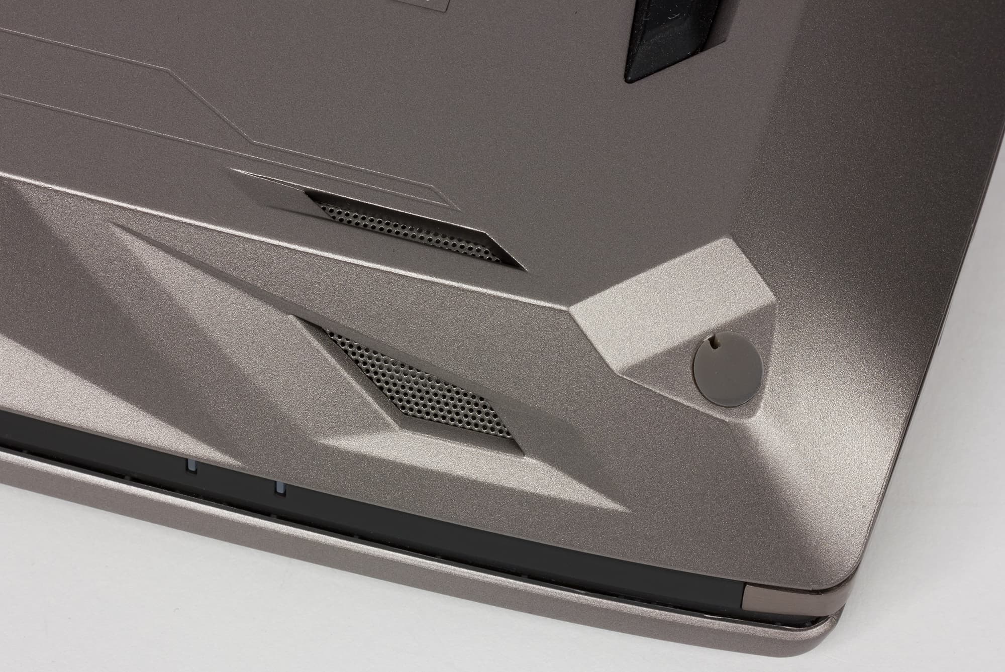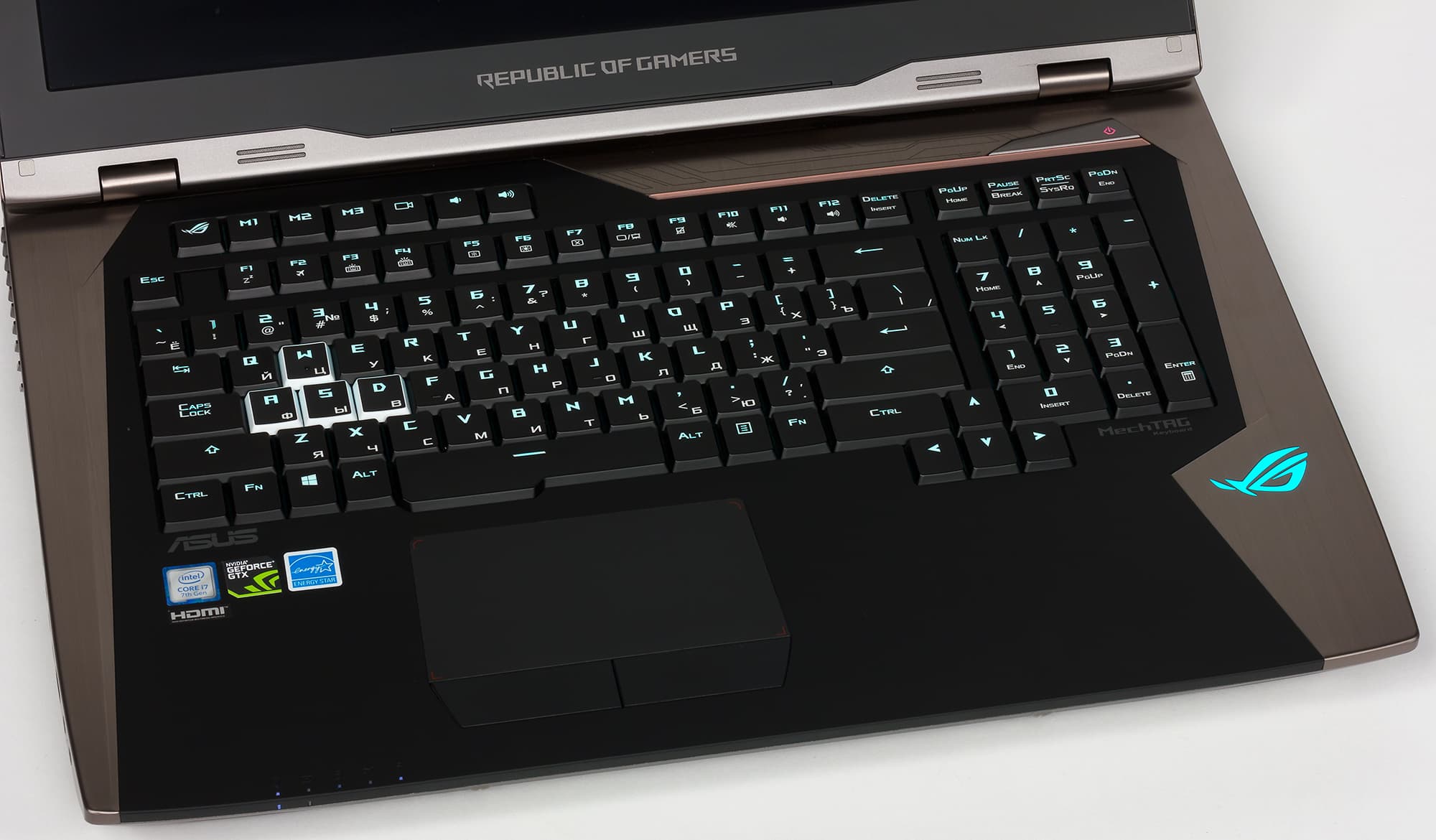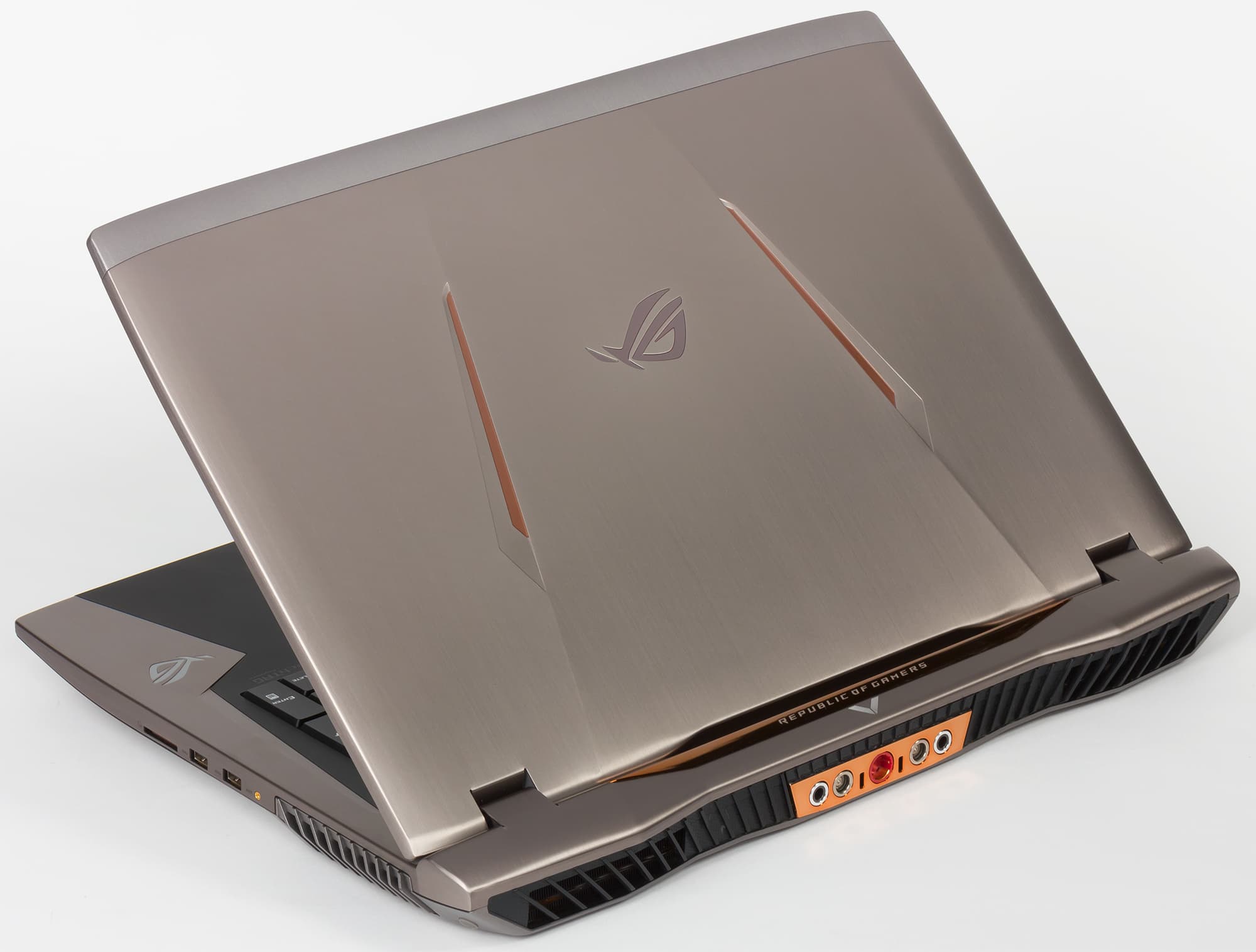Корпус ноутбука выполнен из пластика и металла. Крышка сделана из шлифованного алюминия серебристого, немного с бронзовым отливом, цвета. На крышке красуется зеркальный подсвечиваемый логотип Asus ROG и две подсвечиваемые моддинговые вставки медно-оранжевого цвета.