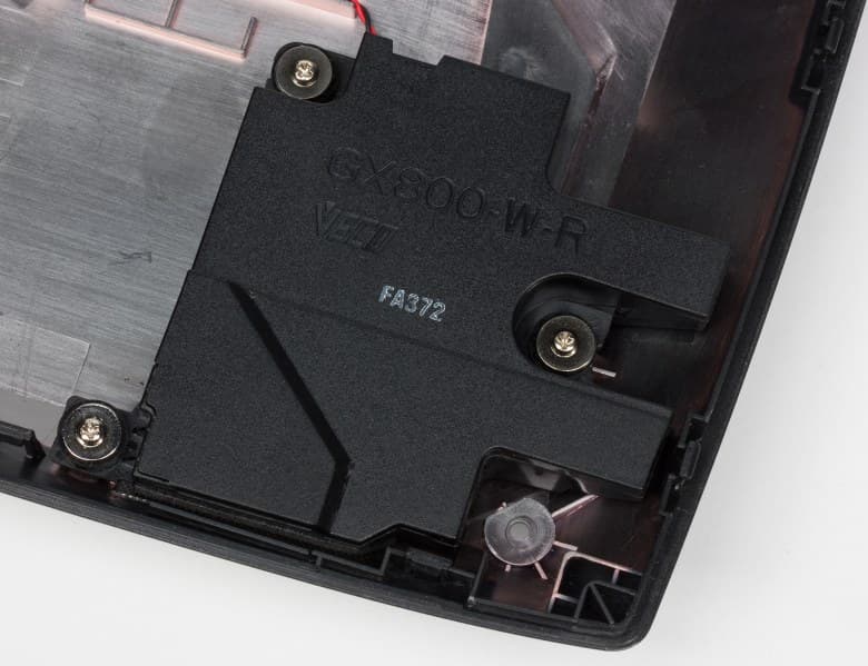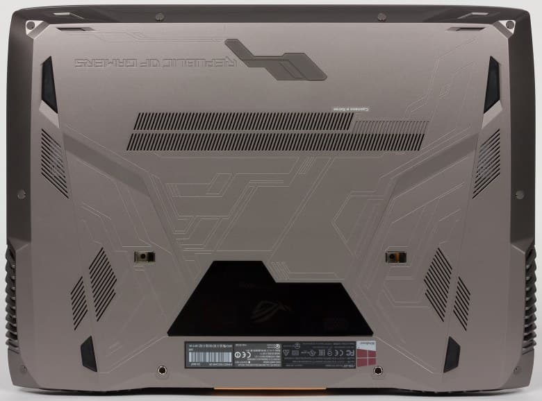 Ноутбук Asus ROG GX800VHK можно достаточно просто разобрать. Для этого на нижней панели корпуса необходимо открутить несколько винтиков, часть которых закрыта резиновыми заглушками, и снять саму нижнюю панель.