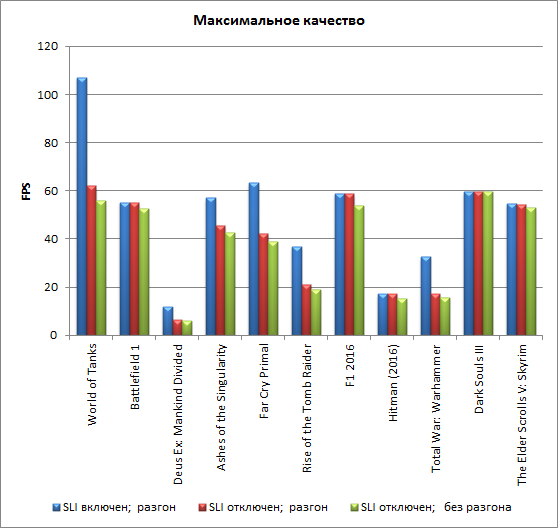 Как известно, режим SLI не всегда положительно отражается на производительности в играх. Поэтому мы протестировали ноутбук Asus ROG GX800VHK в играх как при активированном режиме SLI, так и при отключенном. Отметим также, что в некоторых играх недостаточно просто активировать режим SLI в настройках видеодрайвера — нужно выполнить определенные настройки и в самой игре.