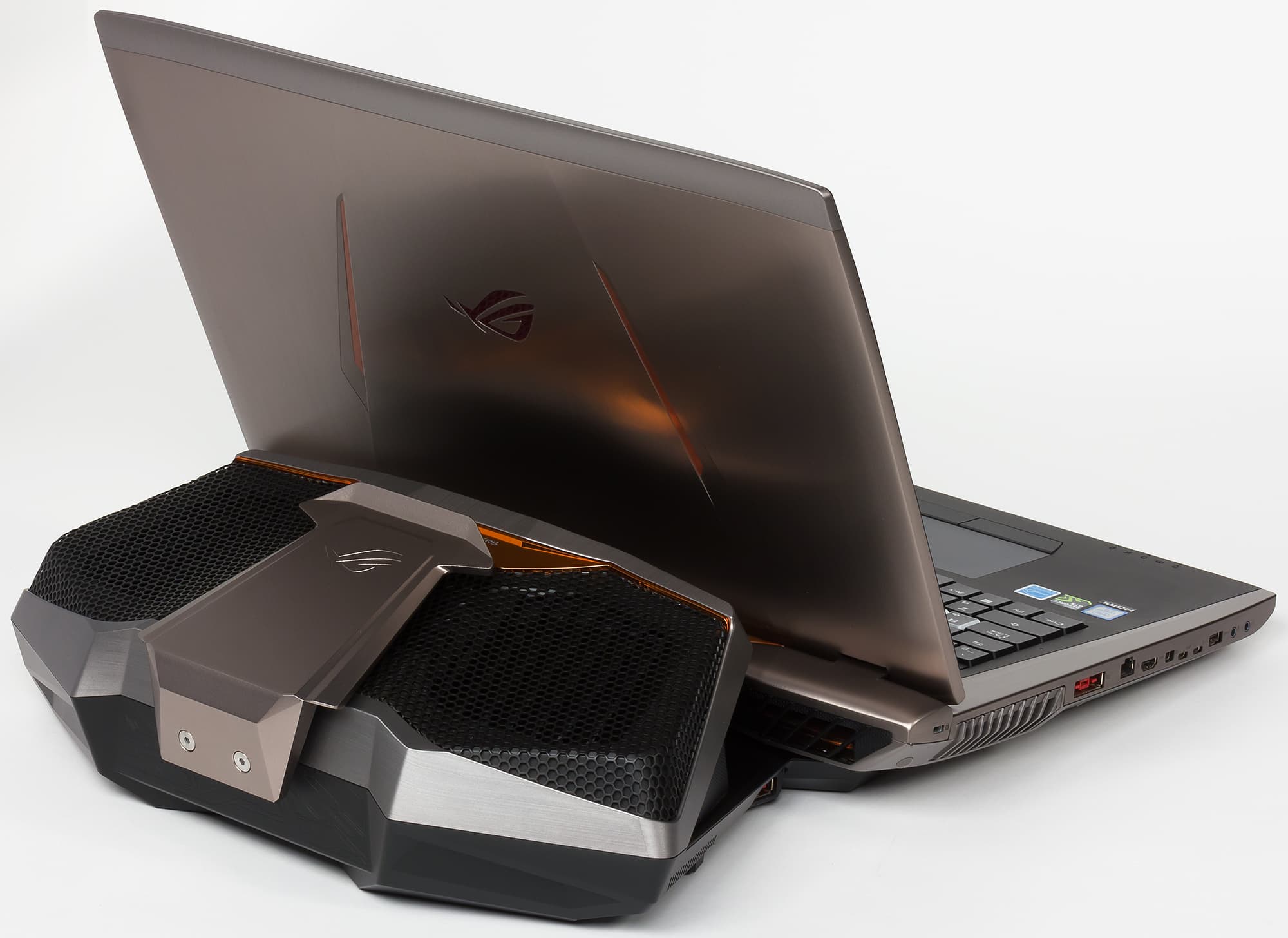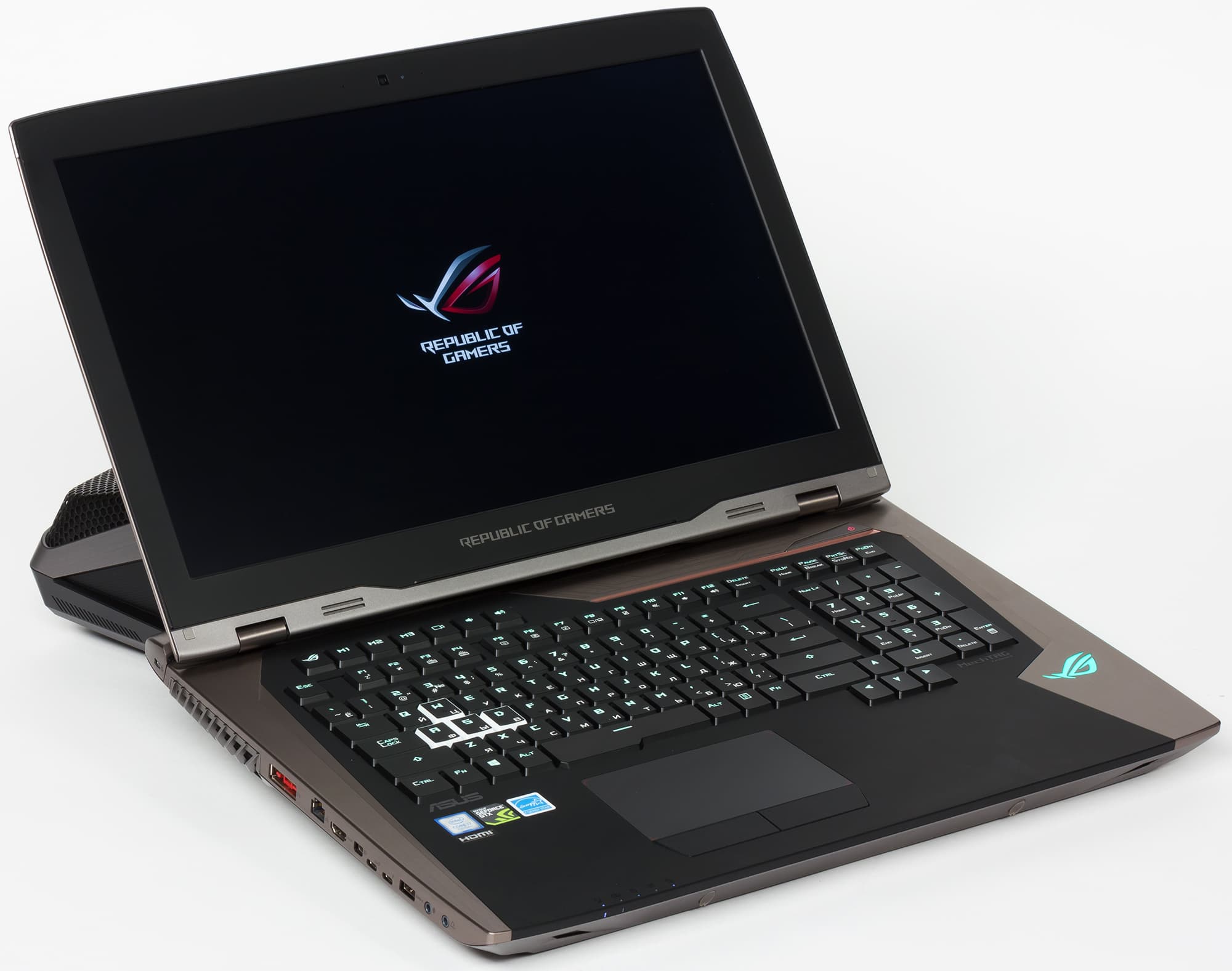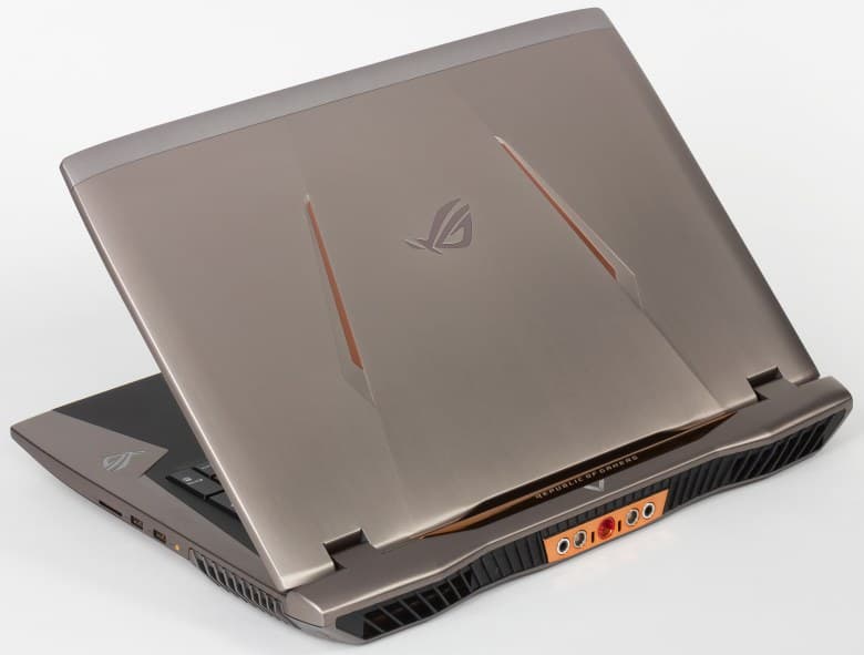 Внешне ноутбук Asus ROG GX800VHK похож на своего предшественника Asus ROG GX700VO, но он немного больше по размерам (все же экран тут 18,4 дюйма, а у Asus ROG GX700VO — 17,3 дюйма).