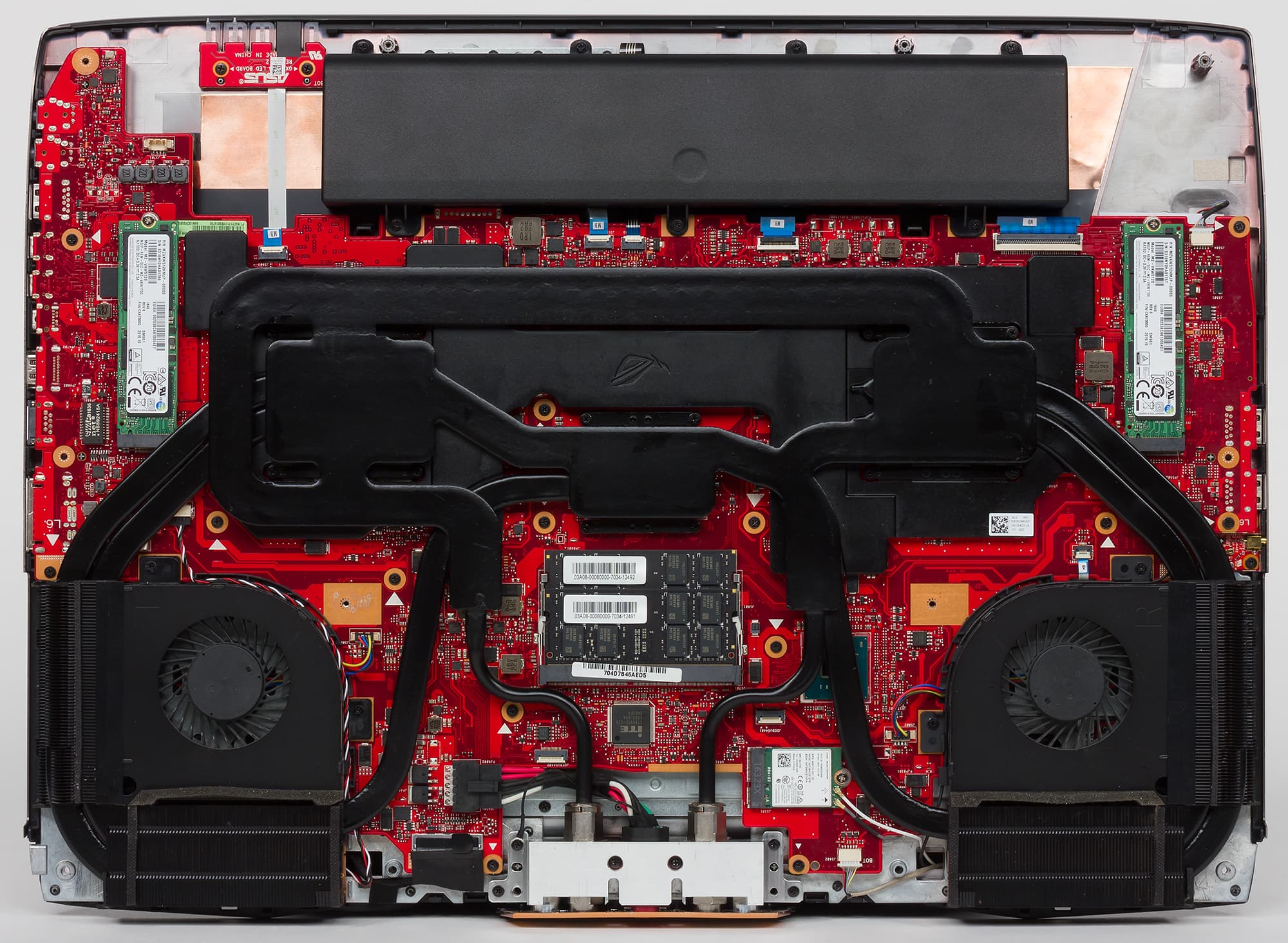 После этого можно получить доступ к аккумуляторной батарее, двум из трех SSD-накопителей, двум из четырех модулей памяти, модулю Wi-Fi и системе охлаждения. Отметим, что системная плата в ноутбуке двухсторонняя, так что еще один накопитель и два слота для установки модулей памяти расположены с обратной стороны. Но чтобы получить доступ к обратной стороне, нужно снимать клавиатурный блок, а это сделать уже непросто.