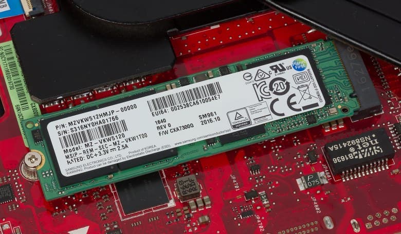 Подсистема хранения данных в ноутбуке представляет собой 3 NVMe SSD-накопителя Samsung MZVKW512HMJP (разъем M.2, интерфейс PCIe 3.0 x4) емкостью по 512 ГБ, которые объединены в RAID-массив уровня 0 (поддержка технологии Intel RST). Суммарный объем RAID-массива составляет 1,5 ТБ.