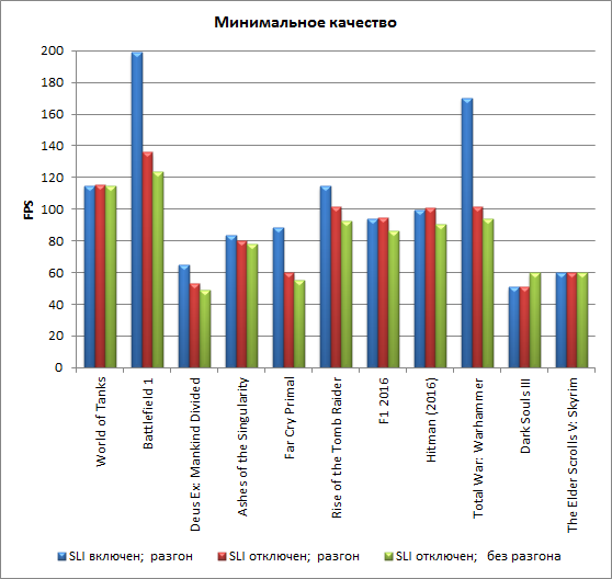 Тестирование проводилось в режимах настройки игр на максимальное и минимальное качество. При тестировании использовался видеодрайвер версии Nvidia ForceWare 385.69, в настройках видеодрайвера принудительно отключалась технология G-Sync.