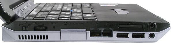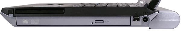 Практически всю правую боковину занимает устройство для работы с оптическими дисками. Справа от него разъем IEEE1394 и разъем источника питания, сверху разъем PCMCIA.