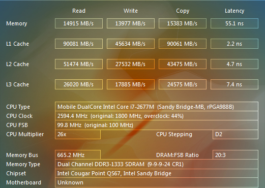 Скорость находится на нормальном уровне. В этом ультрабуке задействован двухканальный режим работы памяти. Кстати, обратите внимание на уровень « оверклокинга» процессора - 44%.