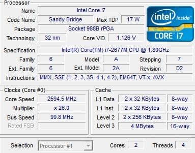 | Процессор | Mobile DualCore Intel Core i7-2677M, 2600 МГц (26×100) | |