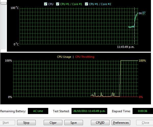 Что, кстати говоря, не так уж и просто. Отображаемая температура что процессора, что ядер оставалась на вполне пристойном уровне. Действительно, именно на этой температуре (особенно в случаях с горячими Core i7 M) Intel Turbo Boost начинает постепенно снижать уровень разгона процессора, чтобы добиться стабильных температурных показателей. В то же время, это не тот уровень, на котором должен начинаться троттлинг процессора, да еще в таких объемах.