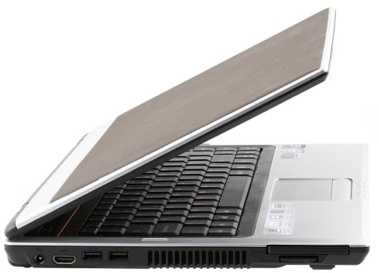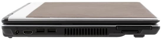 На левой грани расположен порт питания (хотя лучше бы его тоже вынесли на заднюю грань). Рядом с ним находится порт HDMI. Штекер питания угловой, поэтому если загнуть его вперед, то он как раз окажется рядом или над этим портом. Рядом с портом HDMI расположены еще два порта USB 2.0, далее идет решетка вентиляции. В передней части расположены: слот ExpressCard и картовод. Если вставить в слот Expresscard карту расширения, которая сильно выдается из корпуса, то пользоваться картоводом может быть затруднительно.