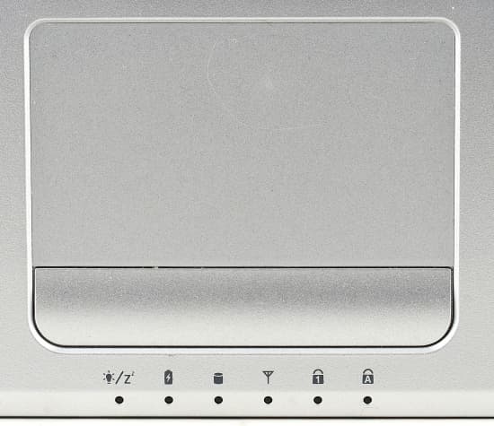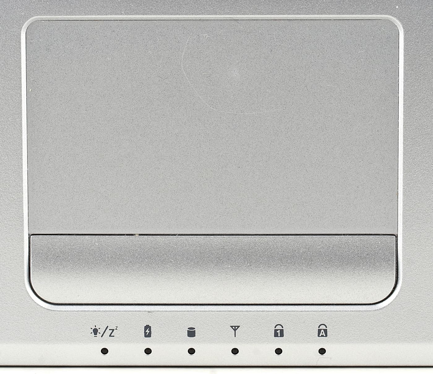 Все индикаторы ноутбука расположены перед тачпадом. Это обычные утопленные в корпус светодиоды, при работе светятся красным. Всего их шесть: индикатор работы ноутбука, индикатор состояния батареи, индикатор обращения к жесткому диску, индикатор работы беспроводных сетей, индикатор режимов Num и Caps lock. При печати они не закрываются ладонями.
