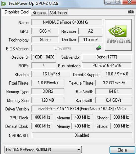 Как уже говорилось, в ноутбуке установлены не самые высокопроизводительные компоненты, тем не менее, R45 способен обеспечить достаточный для домашнего ноутбука уровень производительности, тем более за свою цену. Как уже упоминалось, в тестируемом ноутбуке установлен процессор Intel Core 2 DuoT5750 с частотой 2 ГГц и видеокарта NVIDIA GeForce 8400 M G с частотами 400/400 МГц (скриншоты CPU-Z и GPU-Z)