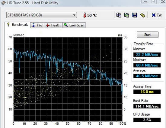 Отдельно была измерена производительность жесткого диска. В тестируемом ноутбуке установлен Seagate Momentus 5400.4 форм-фактора 2,5" емкостью 120 ГБ.