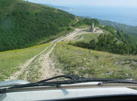 Это не просто крутой склон, это уже настоящие горы, и мы с Morgue скатываемся с уклоном примерно в 40° в направлении построенного в 70-м году ресторанчика (нынче — развалины), где Леонид Ильич любил коротать время с видом на любимую Малую Землю. Море далеко внизу, жены за бортом, фотоаппарат в руках, ноутбук на заднем сидении. Да уж, адреналин еще тот... ;-)