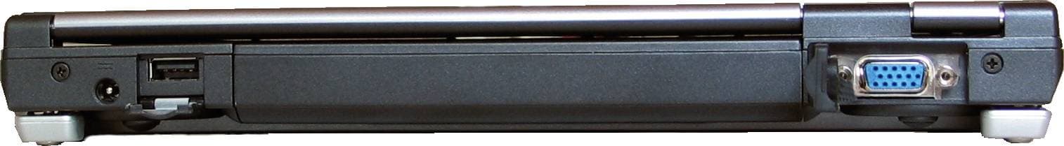 На ней расположен разъем питания, порт USB и порт VGA для подключения внешнего монитора. Обратите внимание: резиновые крышки, прикрывающие порты на тыльной стороне корпуса, приоткрыты мной специальным образом; на самом деле, крышки просто так не откидываются и эластично становятся на место после изъятия разъема.