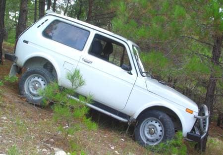 Ни ниже, ни выше ничего ровнее для парковки не было, поэтому машина «стала на якорь», уткнувшись в ствол сосны. Впрочем, парковка — это были еще цветочки, «пестня» была тогда, когда пришло время разворачиваться «карабкаться» вверх по склону. Добрая машина — это, конечно, хорошо, но без доброго водителя Morgue летели бы «клочки по закоулочкам». Кстати, вот так выглядел этот обрыв снизу — где то там, выше за деревцами припаркована машина (Дооб, окрестности Новороссийска, август 2003).