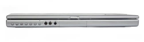 О-о, зато какое тут оживление! Порты, особенно в левой части, напиханы столь плотно, что мешают друг другу. Собственно, здесь у нас собрались все порты расширения. Итак, слева направо: разъем для штекера питания, потом, в опасной близости от него — два порта USB, далее очень близко к ним идет порт IEEE1394, потом — сетевой порт, потом LPT и выход на внешний монитор, потом — 7-штырьковый видеовывод S-video, замок Кенсингтона, модемный порт и весьма скромная решетка вентиляции.