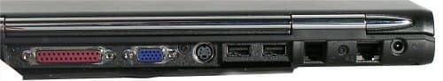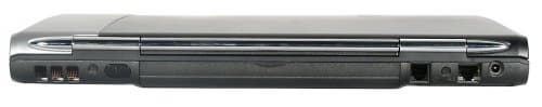 На задней панели, на первый взгляд, не так уж много разъемов. Но это только на первый большая их часть скрыта под пластмассовой крышкой. Справа мы видим решетку вентиляции (заборную), далее идет ИК-порт, по центру располагается эта самая крышка, дальше модемный и сетевой порты, а в самом углу разъем для штекера питания. Задняя панель полукруглая, и разъемы в нее элегантно утоплены. Обратной стороной этого стало то, что их пришлось укорачивать, чтобы без проблем можно было достать язычок штекера. Поэтому пересаживаясь с другого ноутбука, следует всегда помнить, что модемный и сетевой порт здесь перевернуты.
