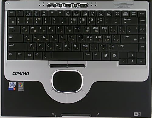 Дополнительные кнопки и индикаторы сосредоточены в центре панели. К кнопкам никаких претензий нет (за исключением того, что они не работают: даже после восстановления Recovery от Compaq , ПО не активируется, их надо настраивать, еще что-то… в общем, я плюнул и не стал разбираться. Минус разработчикам, ПО должно быть интуитивным, а регулировка громкости работать вообще везде, даже в БИОС). Индикаторы активности довольно информативны, хотя простенькие какие-то. А вот основные индикаторы (работа от сети, заряд/разряд батареи) вынесены на передний край клавиатурной панели, из-за чего при закрытой крышке узнать состояние системы проблематично. Живой пример: встаю из-за стола и захлопываю крышку ноутбука. Иногда Windows почему-то не засыпает, что может иметь неприятные последствия для жизни батарейки. Чтобы увидеть, уснул ноутбук или нет, 800с приходится поднимать за переднюю часть и смотреть на «мордочку», в то время как, например, у «Версия Magellan 54 W » или любого IBM это можно сделать с одного взгляда на крышку.