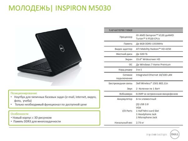 По позиционированию Inspiron 3120 должен быть стильным тонким ноутбуком, портативным, но при этом функциональным и удобным. В нем используется новый тип батареи, что позволяет получить более тонкий корпус.