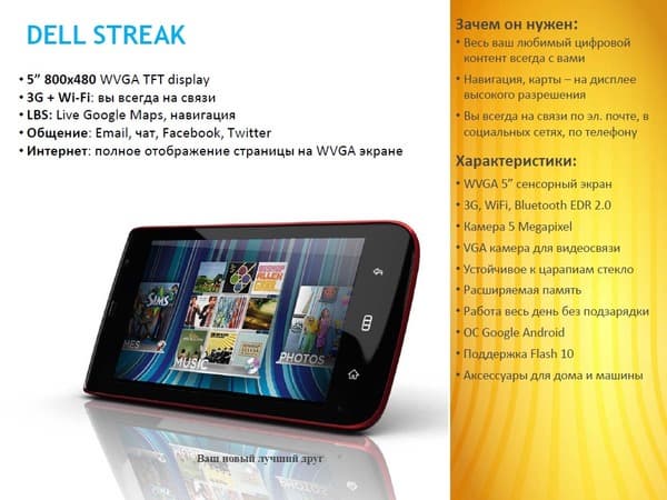 Наконец, последняя и самая интересная новинка, представленная на презентации, — Dell Streak. Это устройство я не фотографировал, но в общем единственное, что можно сфоткать, — это тот же Streak, что и в презентационных фото, только хуже качеством. Гораздо интереснее субъективные впечатления.