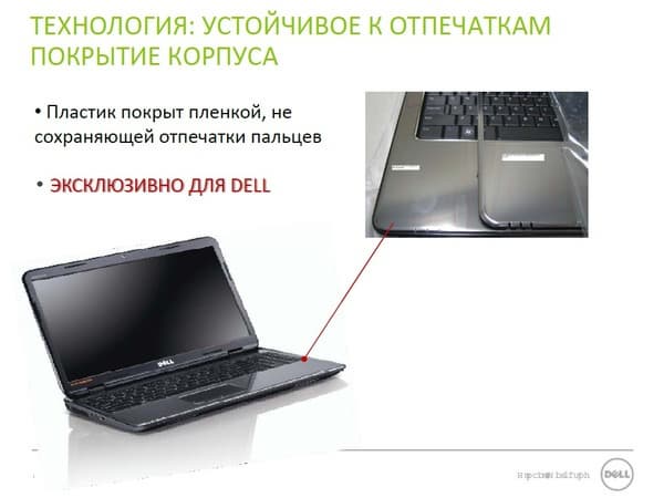 У большинства современных моделей (1120, 1320 и т. д.) применяется новый тип покрытия. Хотя кажется, что оно глянцевое (и, соответственно, внешний вид должен быть получше), но при этом в поверхность внедрена, по словам Дениса Минова, менеджера по маркетингу клиентских продуктов Dell в России, специальная пленка, и эта пленка придает особый вид крышке, но не только: благодаря ей на поверхности не остается отпечатков пальцев. Очень интересно, и мы посмотрим при тесте, что это за поверхность такая. Правда, ноутбук, который Денис крутил во время презентации, за время речи изрядно заляпался.