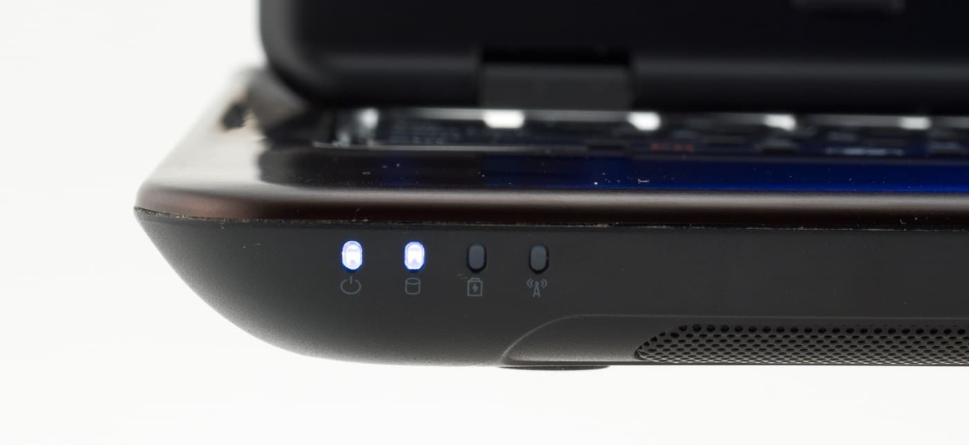 Расположение индикаторов крайне неудобное: они расположены на передней стенке корпуса, но т. к. она закруглена, то смотрят они вниз. Увидеть их при работе с ноутбуком очень сложно, приходится либо нагибать голову, либо поднимать ноутбук со стола. При работе индикаторов не видно вообще, а чтобы понять, например, зарядилась ли батарея у выключенного ноутбука, его приходится приподнимать или брать на руки.