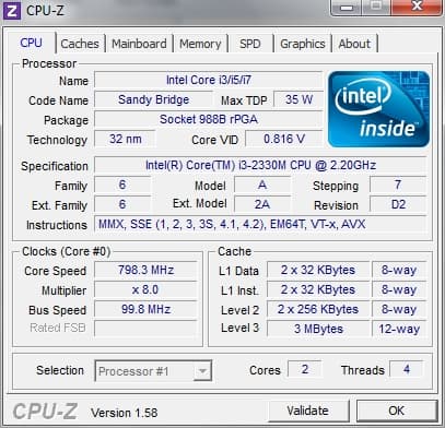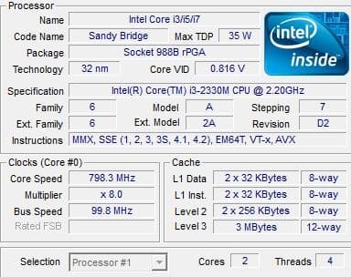 | Процессор | Mobile DualCore Intel Core i3-2330M, 2200 МГц (22×100) |