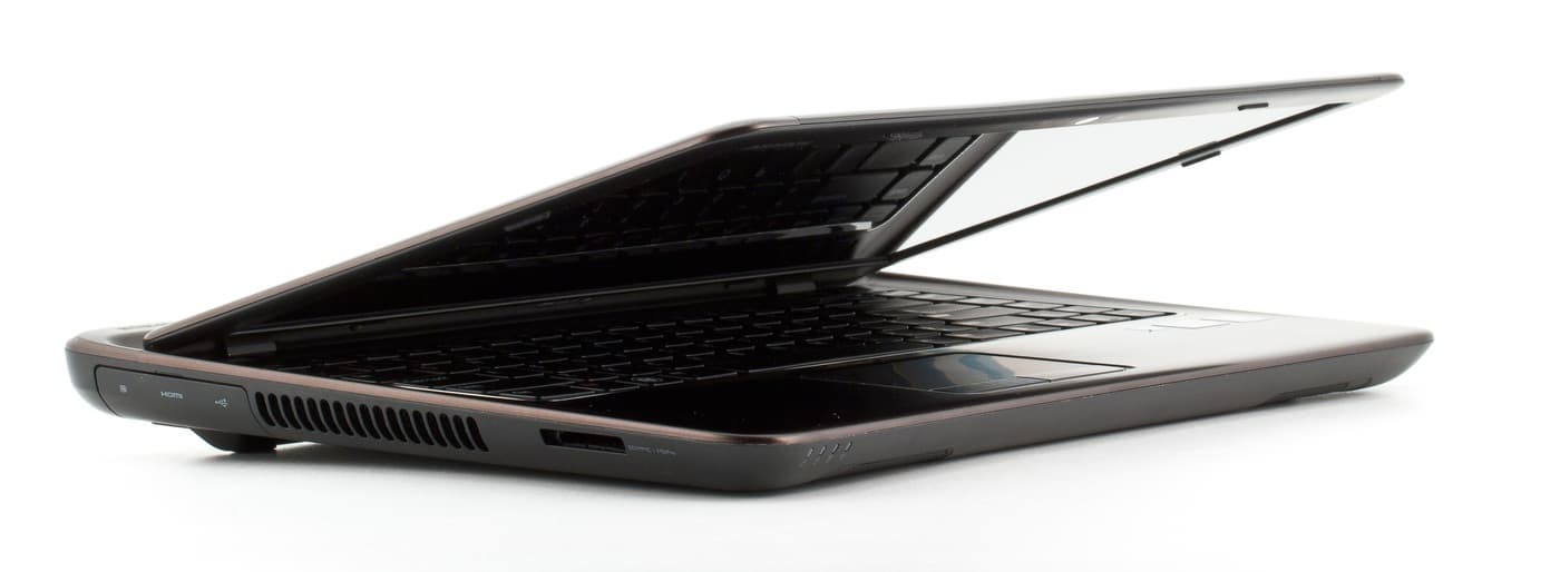 Бока корпуса закруглены книзу: этот ноутбук очень удобно поднимать со стола и вообще носить в руках. Так что если вы часто носите ноутбук в руках, обратите внимание на Dell Inspiron 14z. Но у этого решения есть и минус: разъемы пришлось прятать под крышечки, чтобы они не мешали при переноске и не портили внешний вид. Впрочем, подробнее мы об этом поговорим ниже.