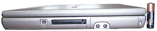 По левую руку от пользователя расположены: порт IEEE1394, pcmcia-слот и заглушка от IR-порта, а также «салазки» винчестера, на которых смонтированы гнезда наушника и микрофона. Для тех, кто не в курсе, PCMCIA-слот это все равно, что PCI на ПК и в него можно устанавливать GPS-устройства, звуковые карты, тюнеры, контроллеры, сетевые карты и т.п. Только в отличие от PCI, PCMCIA поддерживает горячее подключение, т.е. устройства можно менять, не отключая ноутбук от питания. Причем смена происходит легко, благодаря рычагу, встроенному в механизм отсека.