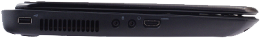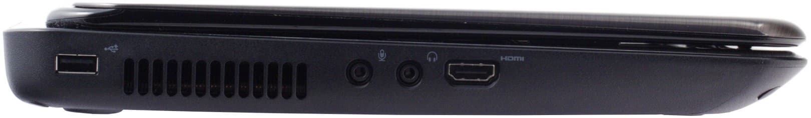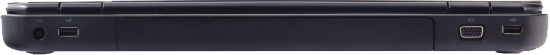 Несмотря на то, что крышка крепится к верхней панели, максимальный угол при открывании, как минимум, не меньше, чем у большинства современных ноутбуков с традиционным расположением петель (а возможно и чуть больше: около 145 градусов). Экран удается оптимально отрегулировать, даже если ноутбук лежит на коленях, хотя было бы, конечно, здорово предусмотреть возможность раскрыть его полностью. И, как видно на фотографии, еще одним следствием такого дизайна стала возможность перенести на заднюю панель часть периферийных разъемов, что теоретически должно способствовать более удобному их расположению. Посмотрим, так ли это в действительности.