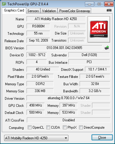 Интегрированное видеоядро работает на штатной частоте, предусмотренной для Radeon HD 4250, собственного видеобуфера не имеется (утилита по ошибке опознала DDR2-память), в реальности видеопамять выделяется из основного объема оперативной памяти.