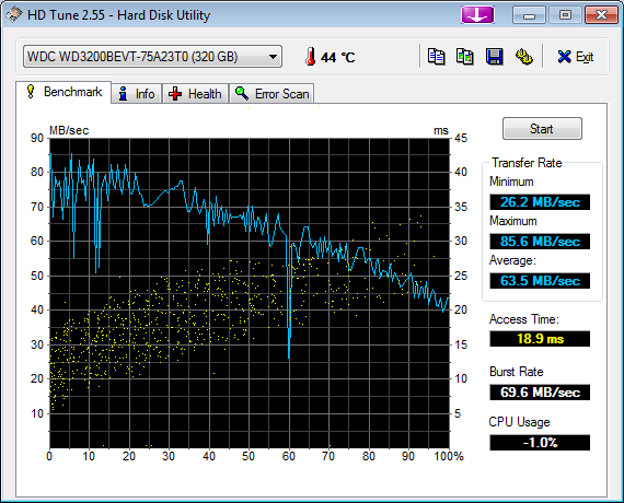 Производительность жесткого диска на типичном уровне для современных моделей с частотой вращения 5400 об/мин, но используемый для сравнения HP G62-a80er достался нам с более скоростным диском на 7200 об/мин, соответственно он в этом сравнении находится в выигрышном положении.