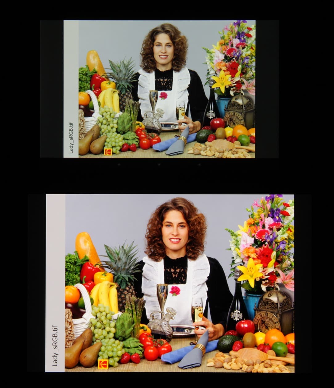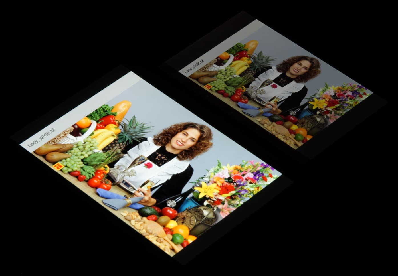 Отметим, что на экранах с широким цветовым охватом без соответствующей коррекции цвета обычных изображений, оптимизированных для устройств sRGB (т.е. считай, что всех), выглядят неестественно насыщенными. Особенно страдают, самые узнаваемые оттенки, например, оттенки кожи.