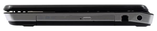 На правой грани корпуса расположен разъем для штекера питания (здесь он не на месте, лучше бы ему быть на левом борту; к тому же, штекер очень длинный и прямой, плюс петля кабеля это занимает немало места), модемный порт и оптический привод. Заметим, что оптический привод в Dell Vostro A560 умеет записывать DVD для этой цены и конфигурации вполне неплохо.