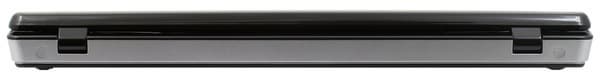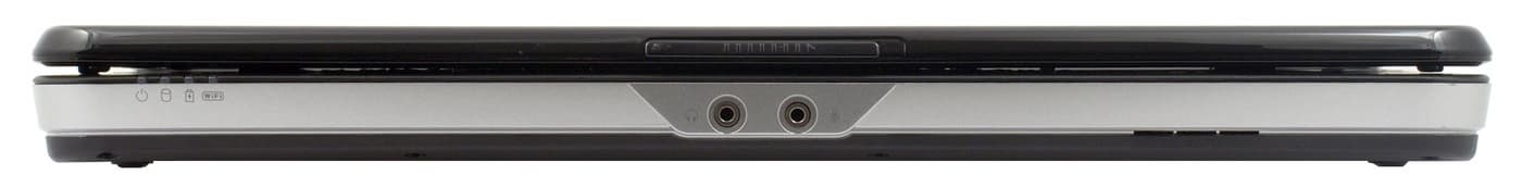 На передней грани прямо по центру расположены выход на наушники и микрофонный вход. Поэтому штекер и торчащие от него провода всегда будут путаться под руками. А штекер будет торчать всегда, если вы захотите пользоваться звуком, так как у этого ноутбука всего один динамик, он расположен правее разъемов. Мне лично этот штекер мешался на протяжении всего тестирования. Левее видно основные индикаторы ноутбука.