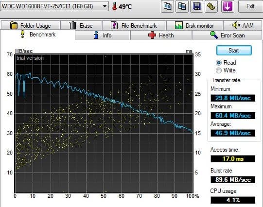 Как видите, оценки слабые. Более-менее неплохой рейтинг только у оперативной памяти, графики (непонятно, почему компьютер насчитал такой рейтинг), а самую высокую оценку получил почему-то жесткий диск. Давайте посмотрим на график его тестирования.