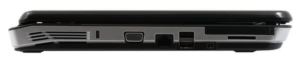 На левой грани расположены: решетка вентиляции, порт замка Кенсингтона, аналоговый выход VGA, два порта USB, маленький порт FireWire, ближе всего к передней грани картовод (в столь дешевой модели его наличие хороший подарок!) и слот ExpressCard.