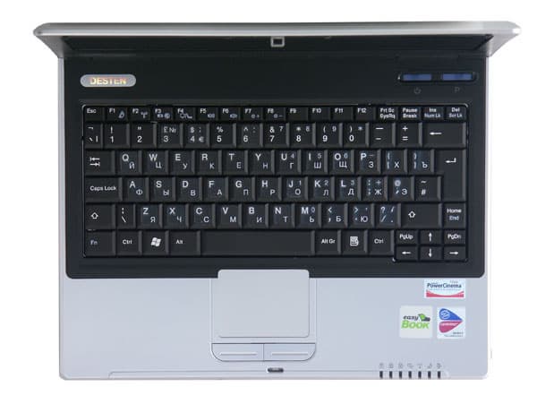 Отсутствие гравировки русских букв объясняется тем, что на тестировании был пре-сейл образец. В компании DESTEN Computers нас заверили, что все «продажные» ноутбуки будут комплектоваться русифицированной клавиатурой. Сама же клавиатура достаточно стандартна для ноутбуков с 12-дюймовой матрицей, но вот раскладка. «@» переехала в правую часть среднего ряда, вопросительный знак в русском алфавите вообще нигде не обозначен. Недостатком можно считать и тот факт, что в очередной раз непонятная клавиша «|,» «съела» часть левого Shift.
