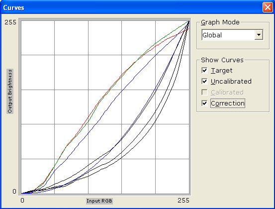 Приведены также графики гамма-кривых, где можно увидеть, насколько гамма-кривые индивидуальных цветов (черные линии) отклоняются от целевой гамма-кривой (синяя линия) и какая требуется коррекция для каждого цвета (соответственно красная, синяя и зеленая линии).