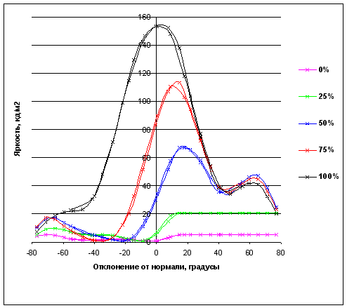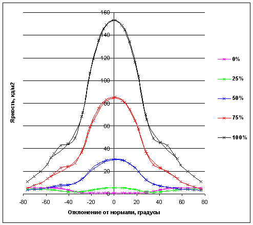 С углами обзора, прямо скажем, дело обстоит плохо. При отклонении вниз полутона инвертируются (пересекаются 0 и 25%) уже при 8°, а 0, 25 и 50% пересекаются при 18°. При отклонении вверх слияние графиков 100% и 75% происходит при 30 градусах, а при 40° к ним присоединяется и график полутона 50% .