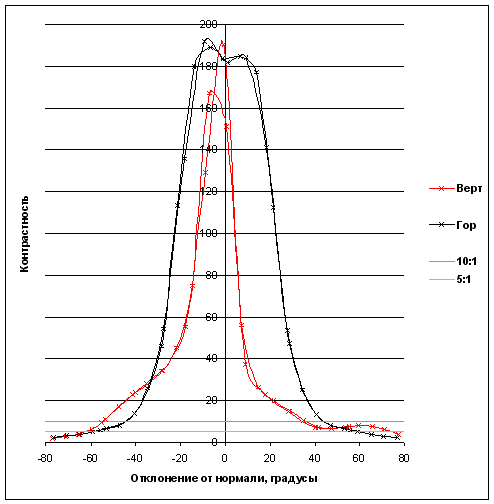 Зависимость контрастности (отношения яркости белого поля к яркости черного) в центре экрана от отклонения оси датчика (отрицательные значения — влево или вниз, положительные значения — вправо или вверх) от нормали к экрану в вертикальной и горизонтальной плоскостях. Зеленая линия — отношение 10:1, голубая — 5:1