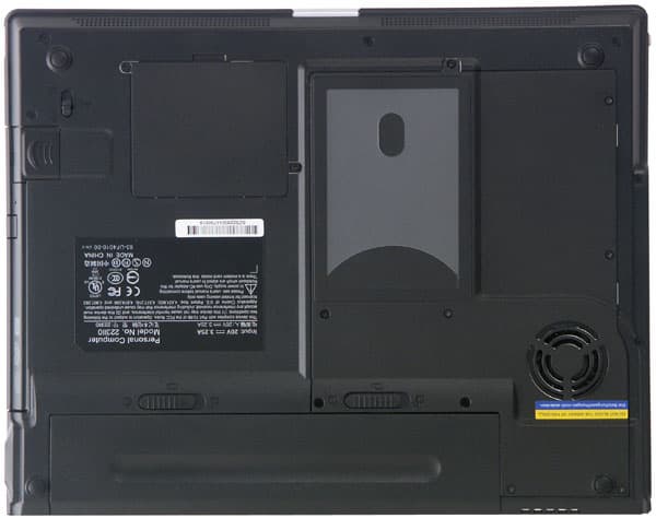 Снизу можно увидеть аккумуляторную батарею, заглушку того самого разъема для USB устройств (слева) с фиксатором, крышку отсека плат mini PCI, и общую крышку отсека системных устройств (справа). На нижней крышке честная надпись «Made in China»
