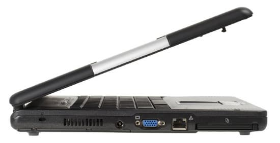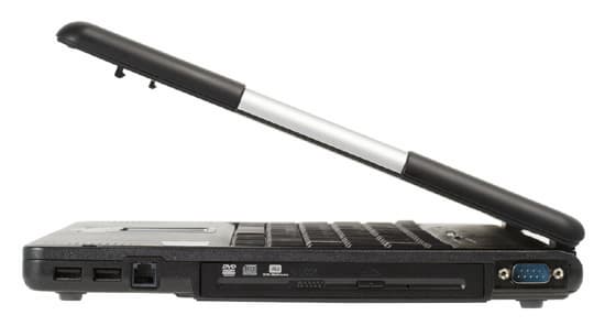 Наконец, на правом борту располагаются два разъема USB (слишком близко к передней грани, может мешать при настольной работе. Если вставлять в них флэшку, то часто задеваешь за нее рукой с мышкой, к тому сам штекер от провода мышки тоже может мешаться), при мобильной работе более-менее удобно. Тут находится разъем для модема. Наконец, на правом боку находится и оптический привод. Его особенностью является механический ползунковый блокиратор выброса, если его закрыть, то привод не откроется при нажатии на кнопку. Это удобно при мобильной работе, когда можно случайно нажать на кнопку выброса и сломать лоток привода. Наконец, на правой грани находится СОМ-порт. Этот вид интерфейса все еще активно используется при настройке различного промышленного оборудования, поэтому его наличие в ноутбуке (да еще таком, предназначенном для суровых условий эксплуатации) можно только приветствовать.